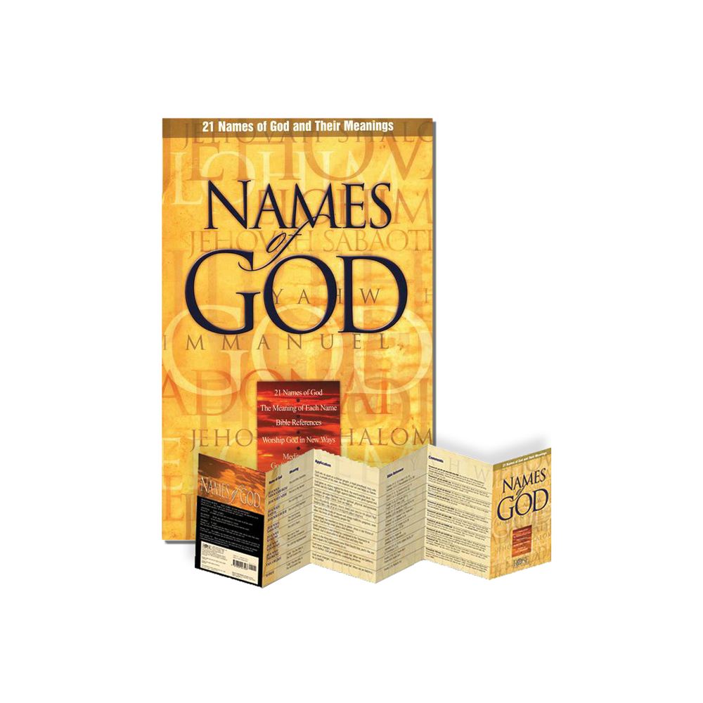 This chart shows 21 Old Testament names of God, gives the definition, a scripture reference, and shows how to apply it to our lives today. This full-color glossy, 12-panel pamphlet is 8 1/2″ x 5 1/2″ and unfolds to 33″ long. It also fits inside most Bible covers.